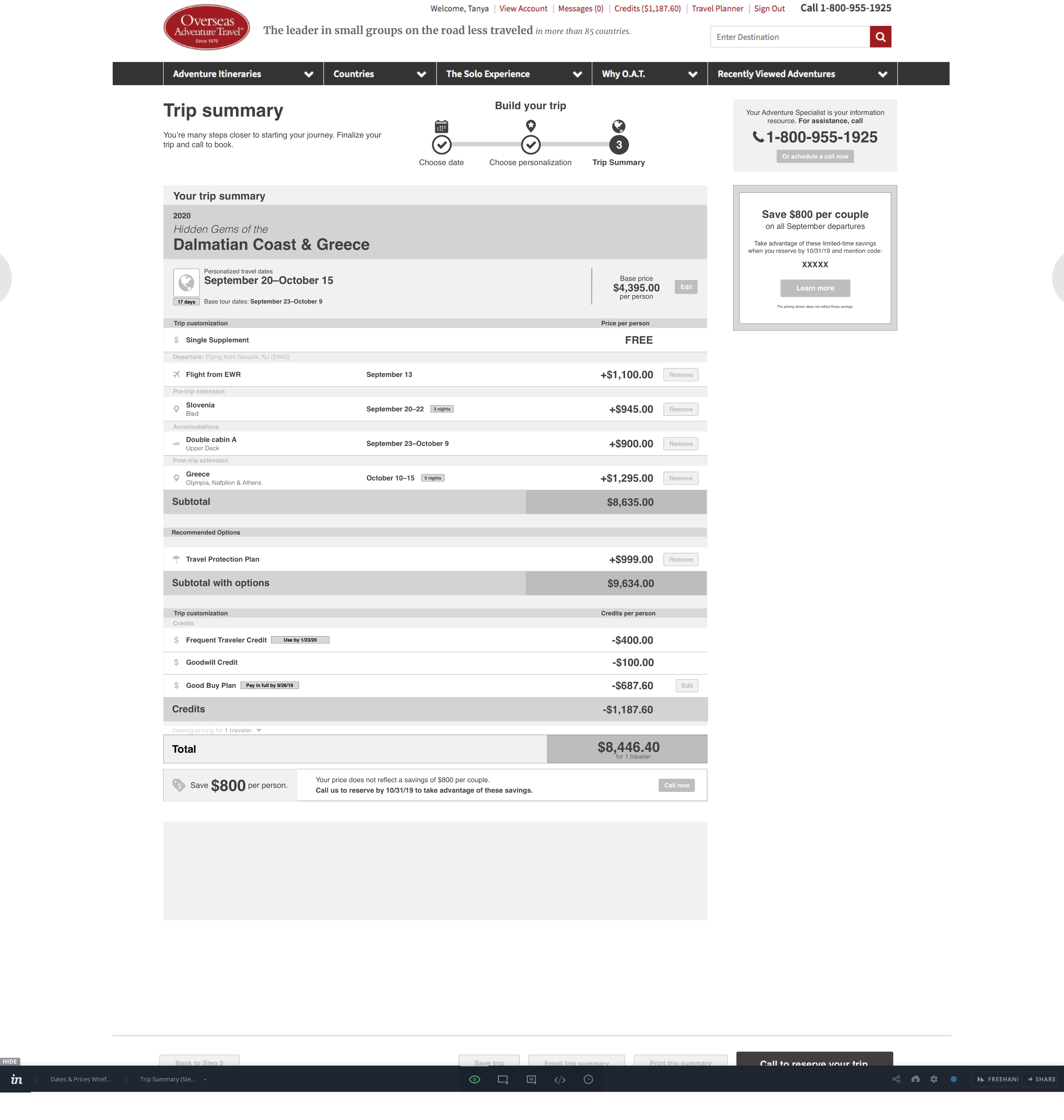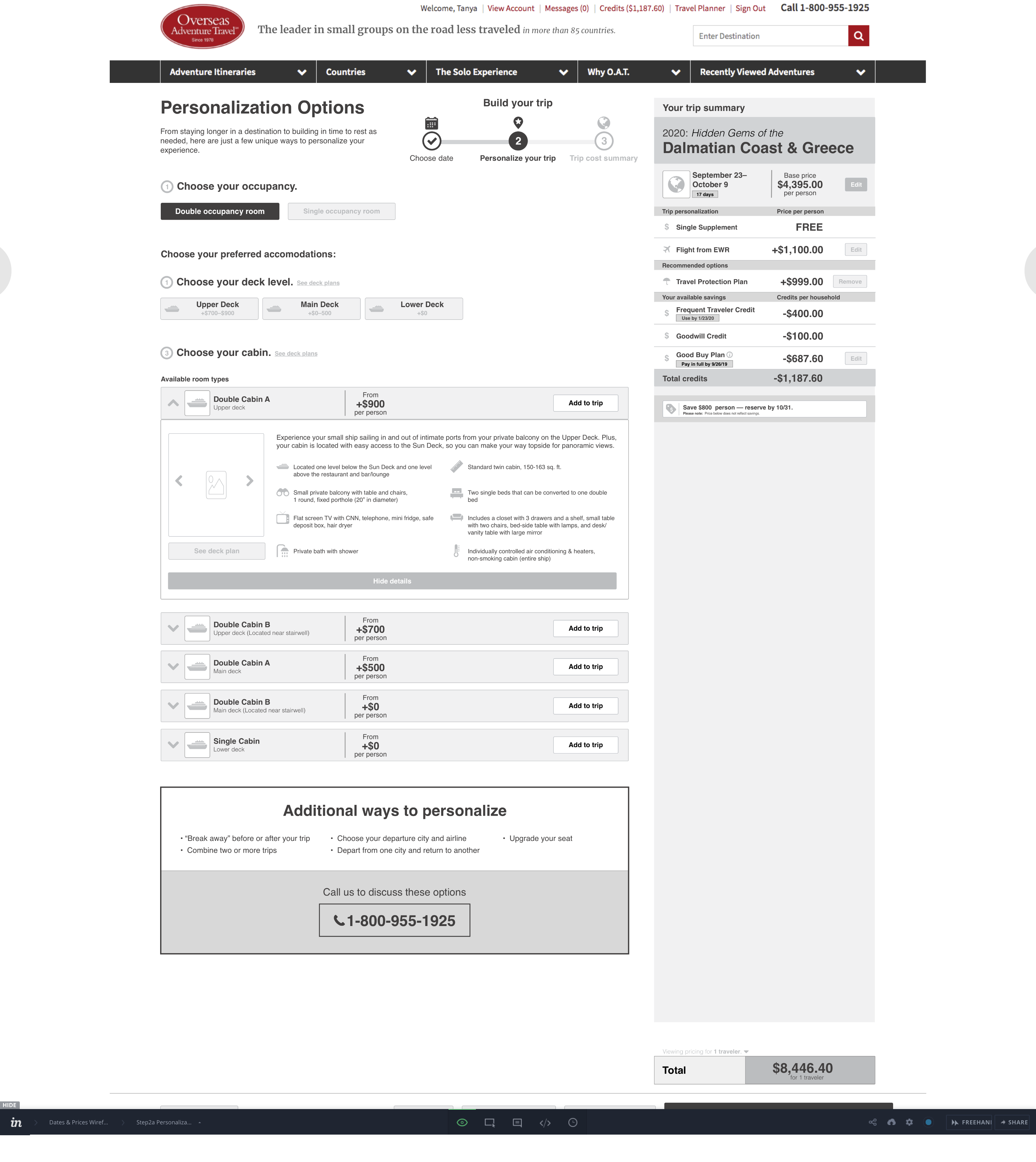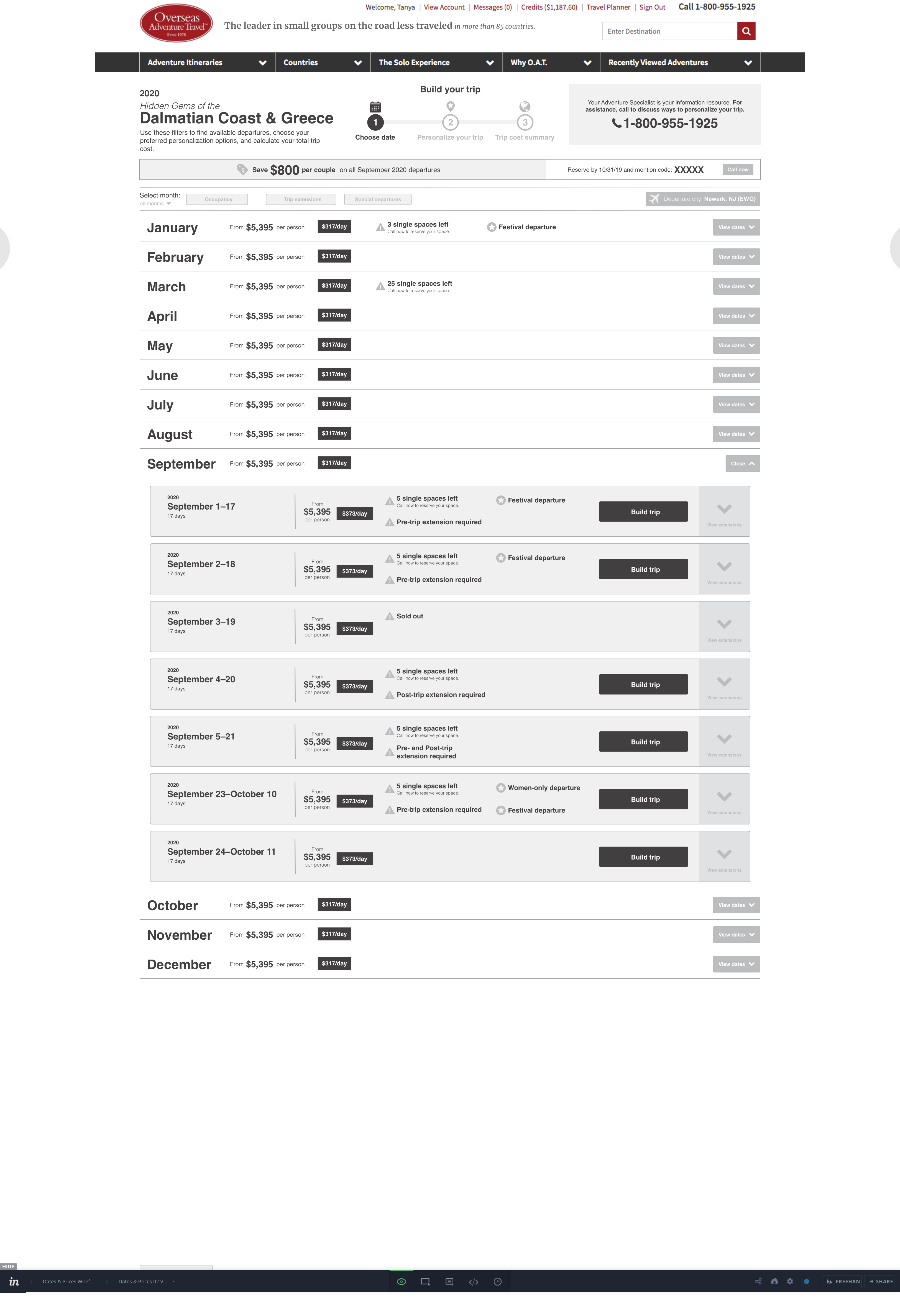 In order to better understand the site’s user flow, I created a user flow map for the Dates and Prices section of the Overseas Adventure Travel site and analyzed the user flow noting where I observed potential usability issues. I found there were several confusing user flow loops and no direct pathway that lead to purchasing a trip among other issues. I then did this same user flow map breakdown for the similar areas of two major competitors, Road Scholar and National Geographic Expedition. I found that these sites funneled their users so that whatever choice was made, it led them closer to purchasing the product, although Road Scholar created a paywall that forces users to sign in to build their trip, which I hypothesis may prevent more users from completing the task.